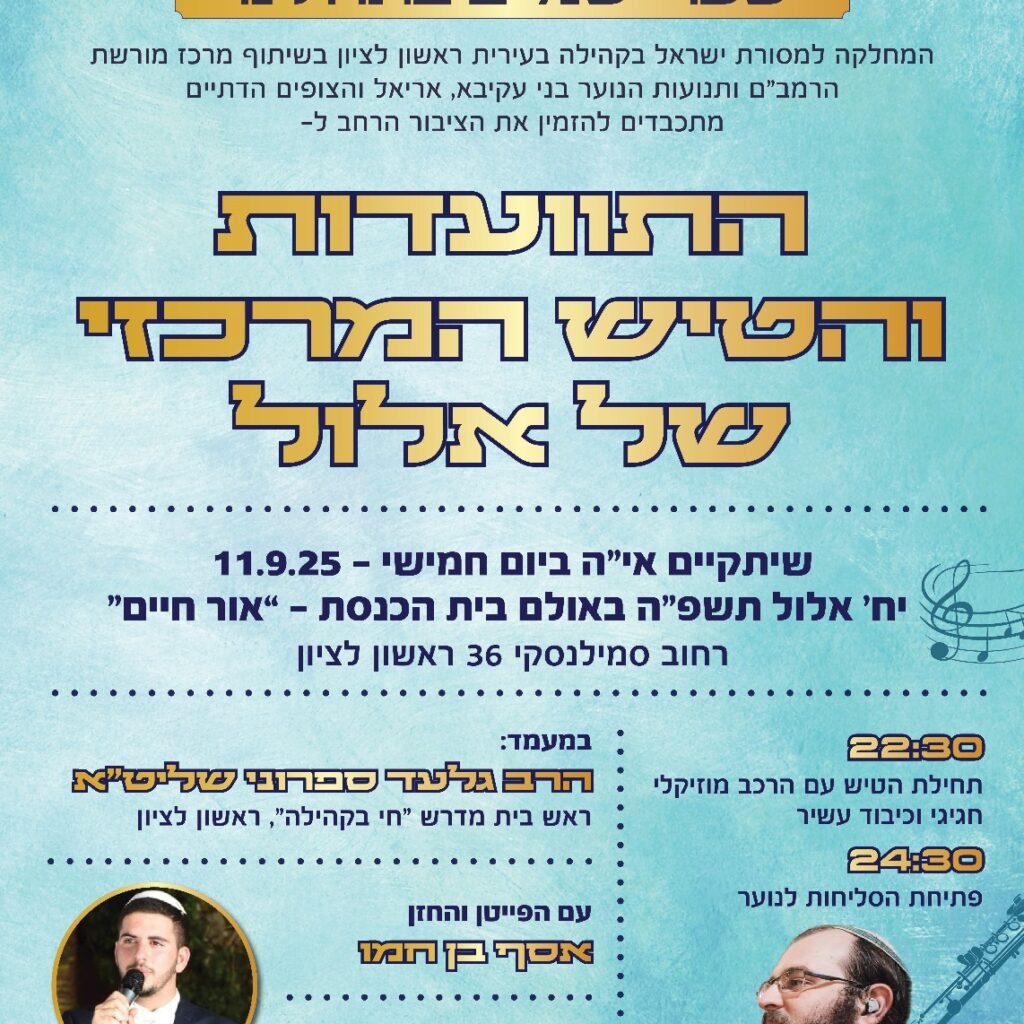 הנכם מוזמנים לטיש המרכזי של אלול. טיש עם הרכב מוזיקלי חגיגי, כיבוד עשיר וסליחות לנוער.
