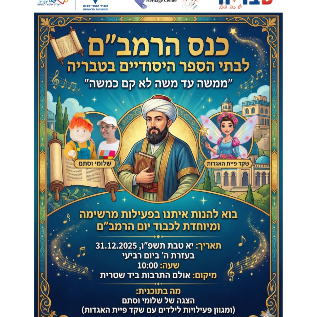 כנס הרמב"ם לבתי ספר יסודיים בטבריה. בתוכנית: הצגה של שלומי וסתם ומגוון פעילויות נוספות